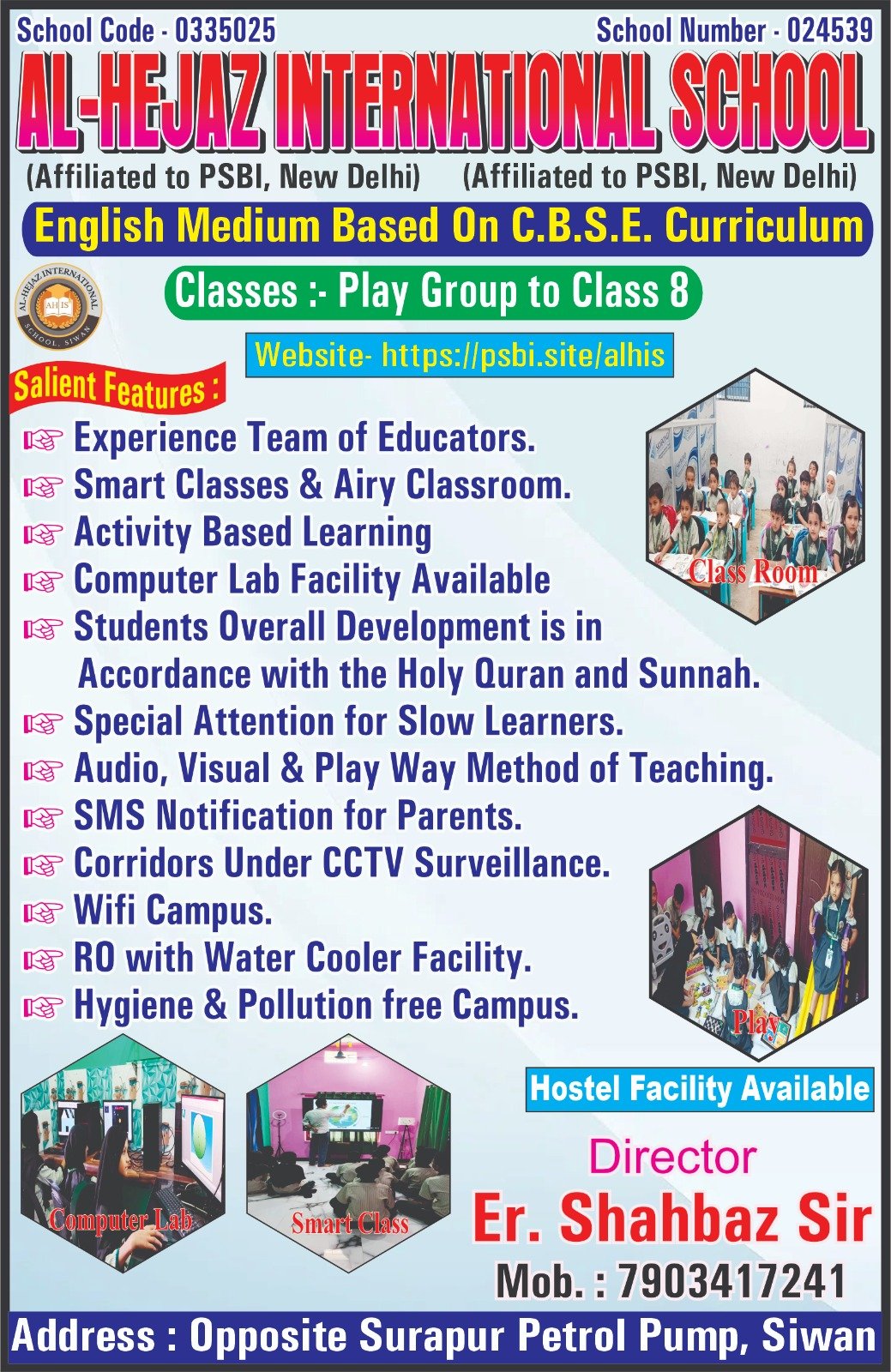 Al-Hejaz International School Is The No. 1 School Of The Area, Well Known For Its Excellent Academic Standards, Disciplined Environment, And Value-based Education. The School Provides A Safe, Caring, And Motivating Atmosphere Where Students Are Encouraged To Learn, Grow, And Achieve Their Full Potential. Along With Modern Education, The School Gives Special Importance To Islamic Education And Deeniyat, Helping Students Develop Strong Moral Values, Good Character, And An Understanding Of Islamic Teachings In Their Daily Lives. Our School Focuses On The Overall Development Of Students, Giving Equal Importance To Academics, Moral Values, Discipline, Sports, And Co-curricular Activities. Experienced And Dedicated Teachers Use Modern Teaching Methods To Make Learning Interesting, Effective, And Meaningful. Special Attention Is Given To Character Building, Confidence Development, And Leadership Skills. Al-Hejaz International School Is Affiliated With The PSBI Educational Council, New Delhi, Which Supports Uniform Education Across The Country. Through This Affiliation, The School Follows A Well-planned Syllabus And Provides Students Opportunities Such As Online Classes And National-level Examinations. With A Strong Commitment To Quality Education, Islamic Values, And Continuous Improvement, Al-Hejaz International School Aims To Prepare Students To Become Responsible, Knowledgeable, And Successful Citizens Of The Nation.